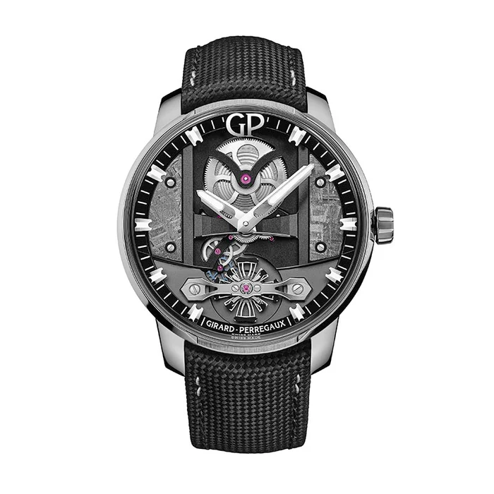 Girard-Perregaux Free Bridge Meteorite 44mm stainless steel automatic micro rotor movement watch featuring a skeleton dial. Presented on a black calf cordura effect strap with stainless steel triple folding buckle. Calibre: GP01800. Water resistant to 30M. Sapphire crystal.