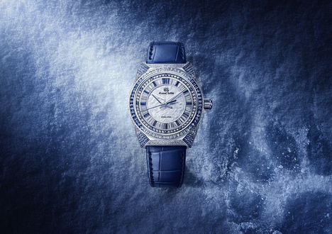 The Spring Drive 8 Days Jewelry Watch’s platinum case is polished and set with diamonds and sapphires on angular lugs, and hand-engraved surfaces. The dial resembles a lion’s mane, surrounded by gemstone hour markers. Powered by the Spring Drive 8 Days Caliber 9R01, the watch offers high accuracy and an eight-day power reserve. The movement’s design symbolizes Mt. Fuji and Lake Suwa.